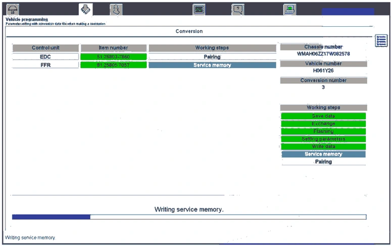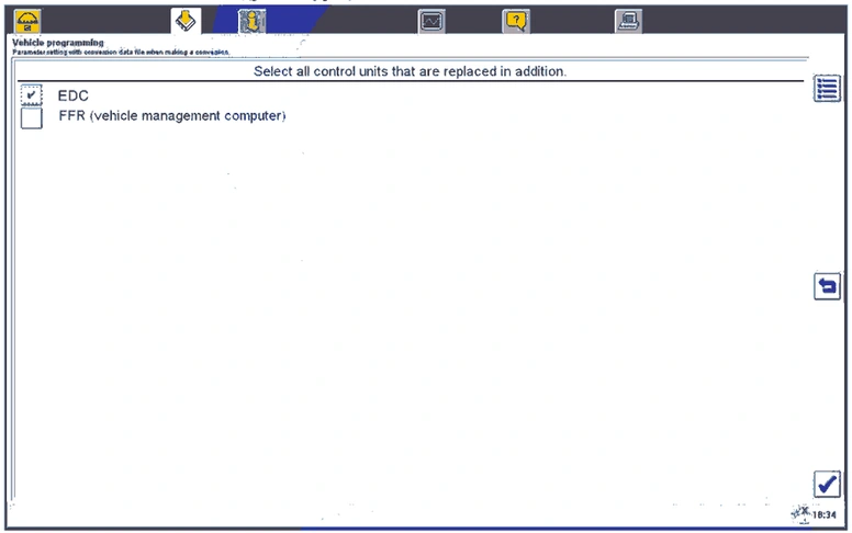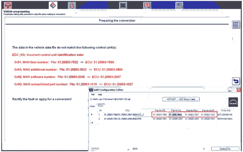 Если замененный EDC имеет разные номера деталей, чем в файле UDF транспортного средства, вам необходимо заменить их на правильные с помощью MAN Configuration Editor и возобновить процедуру преобразования.