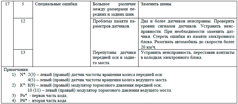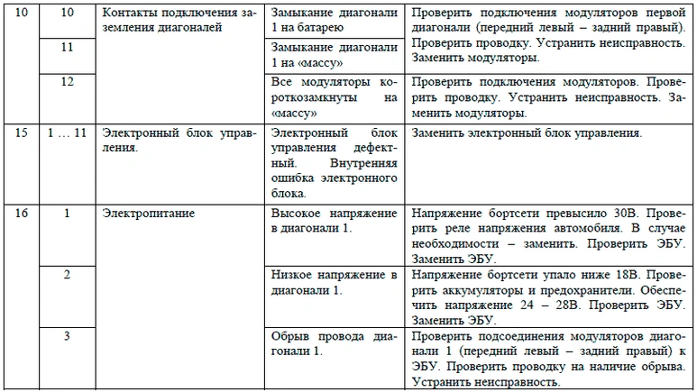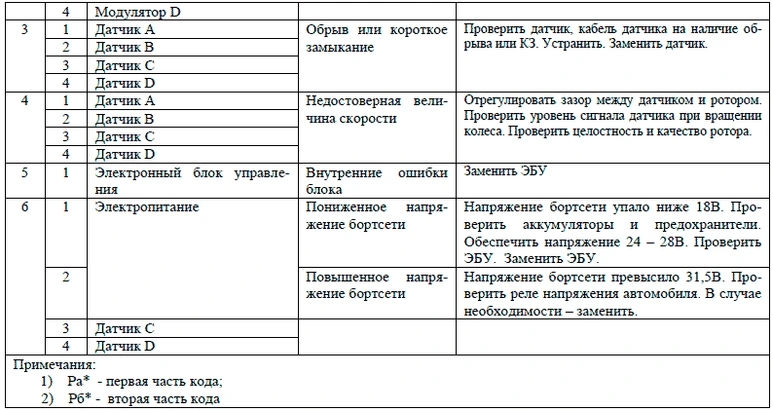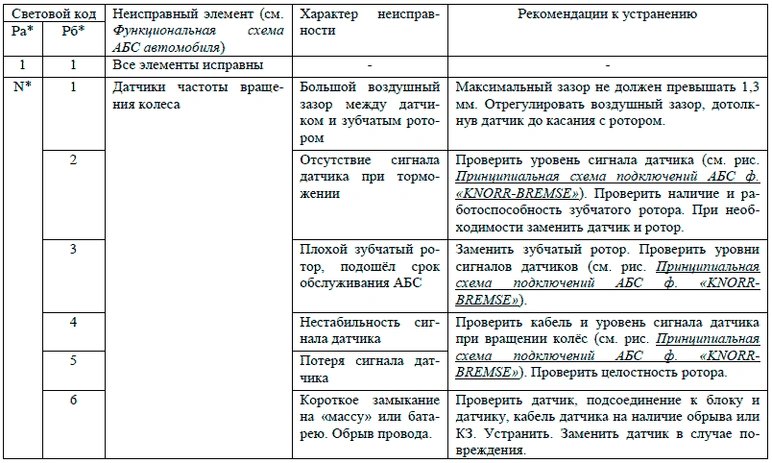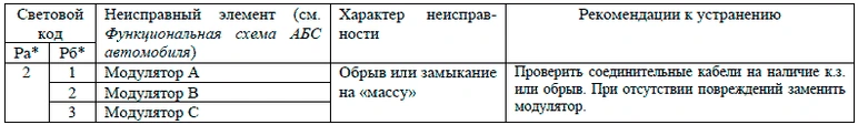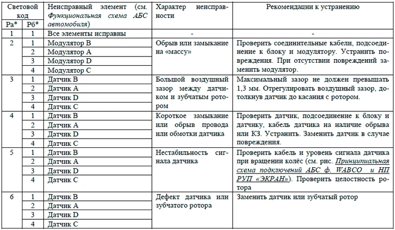 Световой мигающий код о характере неисправности и неисправном элементе системы состоит из двух информационных блоков, представляющих собой два блока световых вспышек. Неисправный компонент и характер неисправности определяются по числу вспышек диагностической лампы соответственно в первом и втором блоках, согласно таблицам Световые коды состояния элементов АБС ф. «WABCO», Световые коды состояния элементов АБС ф. «KNORR BREMZE» и Световые коды состояния элементов АБС НП РУП «ЭКРАН».