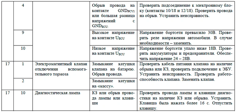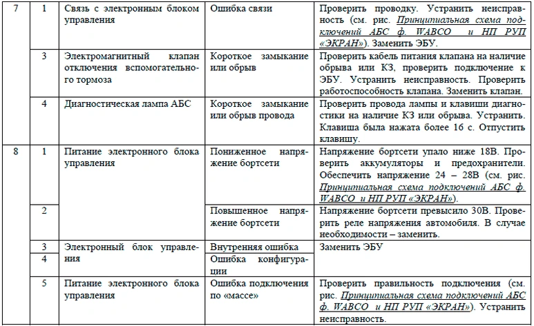 Если диагностическая лампа с символом ABS не гаснет при скорости движения выше 7-10 км/ч, либо после устранения неисправности, определённой по мигающему коду (см. таблицы Световые коды состояния элементов АБС ф. «WABCO, Световые коды состояния элементов АБС ф. «KNORR BREMZE» и Световые коды состояния элементов АБС НП РУП «ЭКРАН»), следует обратиться на сервисную станцию для устранения неисправности.