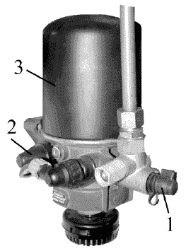 Для поддержания требуемого давления сжатого воздуха, поступающего от компрессора, а также охлаждения и выделения конденсата в тормозной системе автомобиля установлен адсорбентный осушитель воздуха 3 (см. рис. Осушитель воздуха с регулятором давления) фирм «WABCO» или «KNORR BREMZE» (Германия), выполненный совместно с регулятором давления и предназначенный для охлаждения, выделения конденсата и поддержания требуемого давления сжатого воздуха поступающего от компрессора. Подаваемый от компрессора в осушитель сжатый воздух проходит через фетровый диск и гранулант, очищается и попадает дальше в тормозную систему. После заполнения тормозной системы и срабатывания регулятора давления происходит очистка грануланта от влаги воздухом, выходящим в атмосферу из регенерационного ресивера, предназначенного для продувки осушителя через атмосферный вывод осушителя.