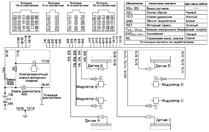 1 (A,B,C,D) - модуляторы АБС; 2 (A,B,C,D) - датчики скорости АБС; 3 – электронный блок управления; 4 – клапан электромагнитный отключения вспомогательного тормоза; 5 – розетка для подключения АБС прицепа