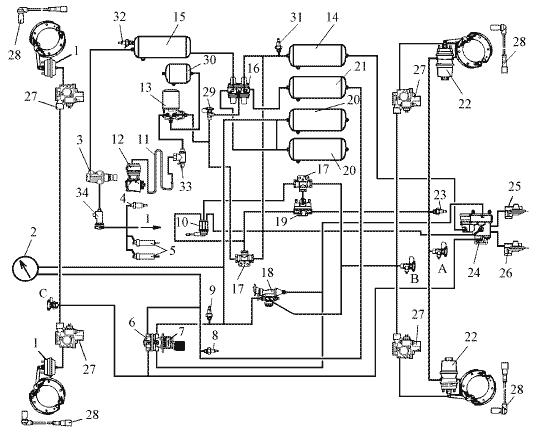 1 – передняя тормозная камера; 2 - манометр; 3* - кран управления вспомогательной тормозной системой; 4* - пневмоцилиндр привода рычага останова двигателя; 5 - пневмоцилиндр привода заслонок механизма вспомогательной тормозной системы; 6 - выключатель сигнала торможения; 7 - двухсекционный тормозной кран; 8 - выключатель контрольной лампы падения давления воздуха в контуре I; 9 - выключатель контрольной лампы падения давления воздуха в контуре II; 10 - кран управления стояночной тормозной системой; 11 - охладитель; 12 - компрессор; 13 - осушитель; 14 - ресивер контура III; 15 - ресивер контура IV; 16 - четырехконтурный защитный клапан; 17 - двухмагистральный перепускной клапан; 18 - автоматический регулятор тормозных сил; 19 - ускорительный клапан; 20 - ресивер контура II; 21 - ресивер контура I; 22 - задняя тормозная камера с пружинным энергоаккумулятором; 23 - контрольная лампа стояночного тормоза; 24 – модулятор АБС; 25 – датчик скорости АБС; 26 - кран экстренного растормаживания; 27 – ресивер регенерационный; 28 - выключатель контрольной лампы падения давления воздуха в контуре III; 29 - выключатель контрольной лампы падения давления воздуха в контуре IV; 32 - выключатель контрольной лампы падения давления воздуха в контуре IV;30 - клапан накачки шин; 31 – клапан электромагнитный; A, В, С - клапаны контрольных выводов; I – к потребителю сжатого воздуха