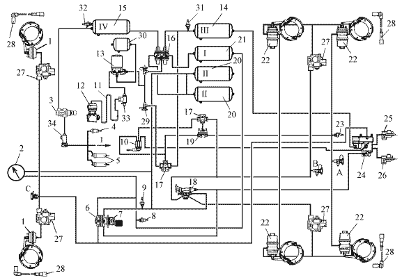 1 – передняя тормозная камера; 2 - манометр; 3* - кран управления вспомогательной тормозной системой; 4* - пневмоцилиндр привода рычага останова двигателя; 5 - пневмоцилиндр привода заслонок механизма вспомогательной тормозной системы; 6 - выключатель сигнала торможения; 7 - двухсекционный тормозной кран; 8 - выключатель контрольной лампы падения давления воздуха в контуре I; 9 - выключатель контрольной лампы падения давления воздуха в контуре II; 10 - кран управления стояночной тормозной системой; 11 - охладитель; 12 - компрессор; 13 - осушитель; 14 - ресивер контура III; 15 - ресивер контура IV; 16 - четырехконтурный защитный клапан; 17 - двухмагистральный перепускной клапан; 18 - автоматический регулятор тормозных сил; 19 - ускорительный клапан; 20 - ресивер контура II; 21 - ресивер контура I; 22 – задняя тормозная камера с пружинным энергоаккумулятором; 23 - контрольная лампа стояночного тормоза; 24 – клапан управления тормозами прицепа; 25, 26 – автоматические соединительные головка (питающая и управляющая); 27 – модулятор АБС; 28 – датчик скорости АБС; 29 - кран экстренного растормаживания; 30 – ресивер регенерационный; 31 - выключатель контрольной лампы падения давления воздуха в контуре III; 32 - выключатель контрольной лампы падения давления воздуха в контуре IV; 33 – клапан накачки шин; 34 – клапан электромагнитный; A, B, C - клапаны контрольных выводов; I – к потребителю сжатого воздуха