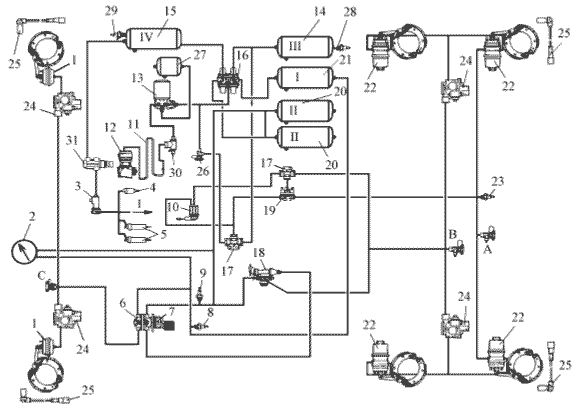 1- передняя тормозная камера; 2 - манометр; 3* - кран управления вспомогательной тормозной системой; 4* - пневмоцилиндр привода рычага останова двигателя; 5 - пневмоцилиндр привода заслонок механизма вспомогательной тормозной системы; 6 - выключатель сигнала торможения; 7 - двухсекционный тормозной кран; 8 - выключатель контрольной лампы падения давления воздуха в контуре I; 9 - выключатель контрольной лампы падения давления воздуха в контуре II; 10 - кран управления стояночной тормозной системой; 11 - охладитель; 12 - компрессор; 13 - осушитель; 14 - ресивер контура III; 15 - ресивер контура IV; 16 - четырехконтурный защитный клапан; 17 - двухмагистральный перепускной клапан; 18 - автоматический регулятор тормозных сил; 19 - ускорительный клапан; 20 - ресивер контура II; 21 - ресивер контура I; 22 - задняя тормозная камера с пружинным энергоаккумулятором; 23 - контрольная лампа стояночного тормоза; 24 – модулятор АБС; 25 – датчик скорости АБС; 26 - кран экстренного растормаживания; 27 – ресивер регенерационный; 28 - выключатель контрольной лампы падения давления воздуха в контуре III; 29 - выключатель контрольной лампы падения давления воздуха в контуре IV; 30 - клапан забора воздуха для накачивания шин; 31 – клапан электромагнитный; А, В, С - клапаны контрольных выводов; I – к потребителю сжатого воздуха