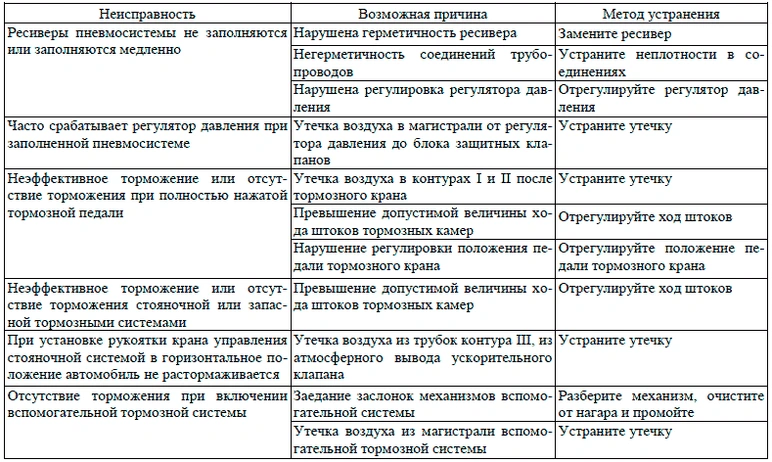 Причиной неисправности тормозной системы могут быть отказ в работе пневмоаппаратов, нарушение регулировок, а также утечки сжатого воздуха в пневмоприводе из-за негерметичности соединений трубопроводов и гибких шлангов. О негерметичности контуров пневмопривода сигнализируют светящиеся лампы предупредительных сигналов и зуммер.