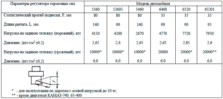 Величину давления и длину рычага РТС для снаряженного автомобиля необходимо устанавливать в соответствии с Таблицей установочных параметров регулятора тормозных сил.
