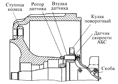 Датчики угловой скорости индуктивного типа, установленные в колесах передней оси и заднего моста, состоят из зубчатого ротора, напрессованного на ступицу, и датчика, установленного в поворотном кулаке передней оси (см. рис. Установка датчика АБС в колесе передней оси) или на кронштейне заднего моста (см. рис. Установка датчика АБС в колесе заднего моста).