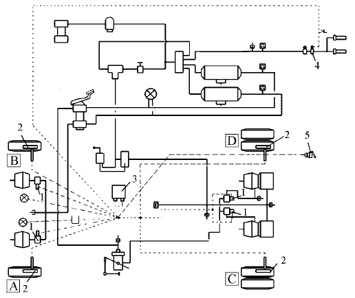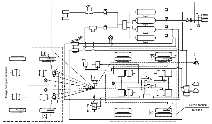 1 (A,B,C,D) - модуляторы АБС; 2 (A,B,C,D) - датчики скорости АБС; 3 – электронный блок управления; 4 – клапан электромагнитный отключения вспомогательного тормоза; 5 – розетка для подключения АБС прицепа.