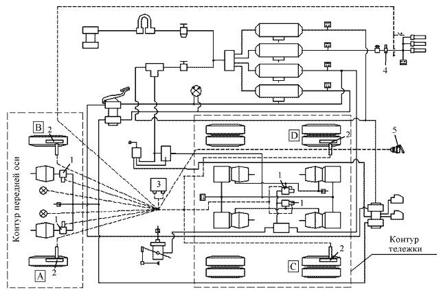 1 (А, В, С, D) - модуляторы АБС; 2 - датчики скорости АБС; 3 - электронный блок управления; 4 - клапан электромагнитный отключения вспомогательного тормоза; 5 - розетка для подключения АБС прицепа