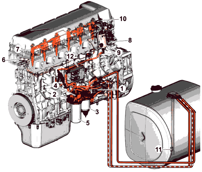 Дизельное топливо всасывается через сетчатый фильтр из бака через охлаждающий змеевик (2) под контролем блока управления двигателем, а затем поступает в корпус топливного фильтра (3). Оттуда топливо проходит через сливной насос (4), обратные клапаны (5) и первичный фильтр (6) с водоотделителем (7). После этого дизельное топливо всасывается через впускной сетчатый фильтр (8) в дизельный насос низкого давления (А) внутри насосного узла (1) дизельного двигателя, а также в корпус топливного фильтра (3). Затем топливо проходит через основной фильтр (9) и поступает обратно в топливный насос высокого давления (В) внутри дизельного насосного узла (1).