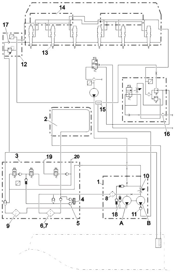Неиспользуемое дизельное топливо возвращается из форсунок по продольному каналу в головке цилиндров. Возвратное топливо проходит через DCM (12), возвратный обратный клапан (17) и направляется назад в бак дизельного топлива. Перепускной клапан регулирует давление выше по потоку.
