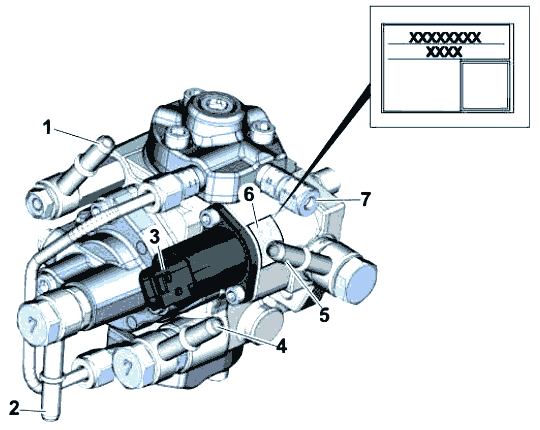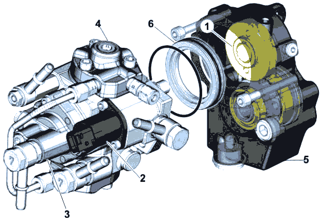 Дизельный топливный насос подает дизельное топливо под давлением до 300 бар на форсунки через топливную рампу высокого давления. Он имеет встроенный впускной дозирующий клапан (2) для регуляции давления. Насос всасывает топливо из бака автомобиля топливный охладитель ЕСМ и фильтр в сборе. Узел состоит из 2 насосов: низкого давления и высокого давления. Насос низкого давления (3) служит для подачи топлива под давлением 5-7 бар на 7-ю форсунку. Насос высокого давления (4) служит для подачи топлива под давлением до 300 бар на форсунки через коллектор и топливную рампу высокого давления.