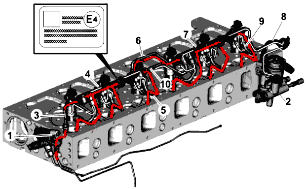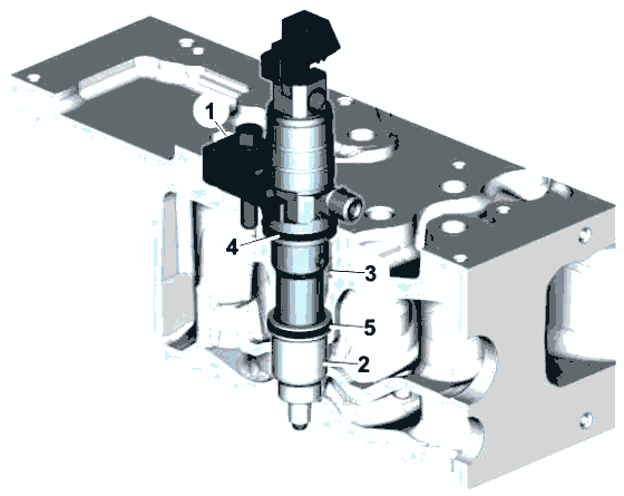 Круглая выемка для возврата топлива (3) вокруг каждой форсунки также уплотняется уплотнительным кольцом (4).