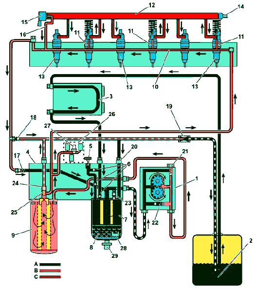 Подающий насос (1) нагнетает топливо в корпус топливного фильтра (4) и через основной фильтр (9) вверх, в продольный топливный канал в головке цилиндров (10) . По этому каналу топливо подается на каждую насос-форсунку (11) через кольцевой канал вокруг каждой форсунки в головке цилиндров.