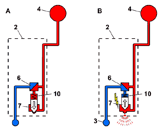 Форсунка (2) может находиться в двух положениях – закрытом (A) или открытом (B).