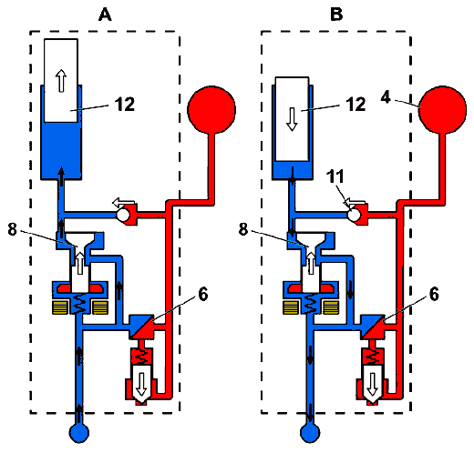 (B) : Клапан регулирования давления (8) не активизирован. Поршень (12) перемещается вниз и