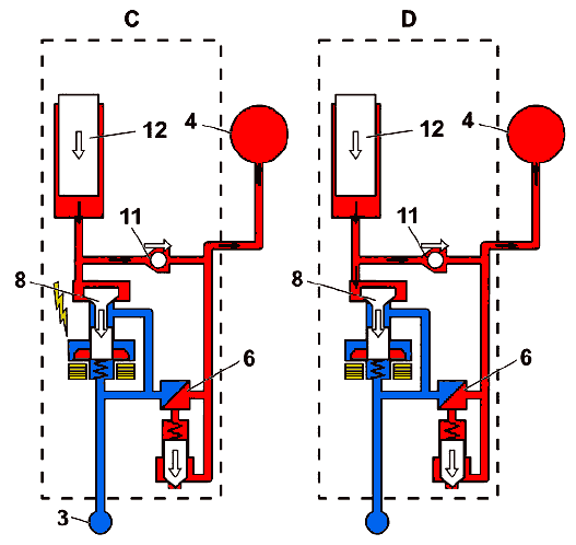 (C) : Клапан регулирования давления (8) активизирован и закрывает обратный поток на топливный канал в головке цилиндров (3) . Обратный клапан (11) открывается, и в топливном аккумуляторе (4) повышается давление под действием поршня (12) , движущегося вниз.