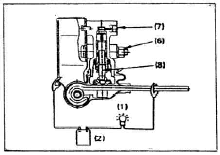 3. Ослабьте гайки (6) и поднимите клапан (7) вверх до упора. Медленно опускайте клапан до тех пор пока не загорится контрольная лампа (1). В этом положении затяните гайки (6)