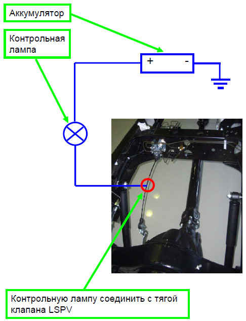 2. Соедините «+» контрольной лампы (1) с «+» клеммой аккумулятора (2). «-» контрольной лампы (1) соедините с тягой клапана LSPV (4).