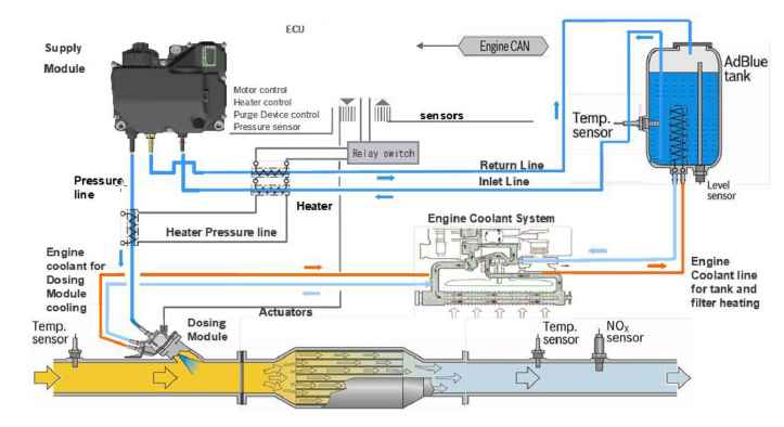 Модуль в резервуаре для хранения DEF включает в себя датчики уровня и температуры реагента. Встроенный подогреватель бака позволяет нагреть DEF до нужной температуры для её подачи в гидравлический контур SCR.
