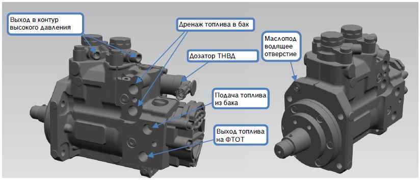 Подкачивающий насос ТНВД с высоким передаточным числом располагается на конце кулачкового вала. Он предназначен для забора топлива из бака и подачи его к фильтру тонкой очистки топлива (ФТОТ). От ФТОТ по контуру низкого давления топливо подходит к дозатору, находящемуся в верхней части ТНВД. Дозатор ТНВД контролирует объём топлива, подаваемого на сжатие в ТНВД, в зависимости от потребности.