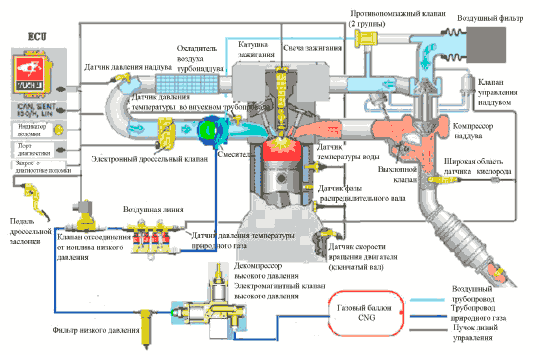 охлаждающая жидкость двигателя подается в редуктор для нагрева газа. Природный газ под рабочим давлением проходит через фильтр низкого давления, отсечной клапан низкого давления, и попадает в систему впрыска топлива, которая дозирует количество впрыскиваемого газа в соответствии с конкретными условиями эксплуатации двигателя. Природный газ и воздух полностью смешиваются в смесителе, попадают в цилиндр двигателя, а затем сжигаются при помощи свечи зажигания. Время зажигания управляется ЭБУ, кислородный датчик контролирует количество остаточного кислорода в отработанном газе и производит вычисление соотношения воздуха и топлива. На последнем этапе ЭБУ изменяет количество природного газа, впрыскиваемого по времени в соответствии с сигналами обратной связи от датчика кислорода и датчика абсолютного давления на впускном коллекторе.