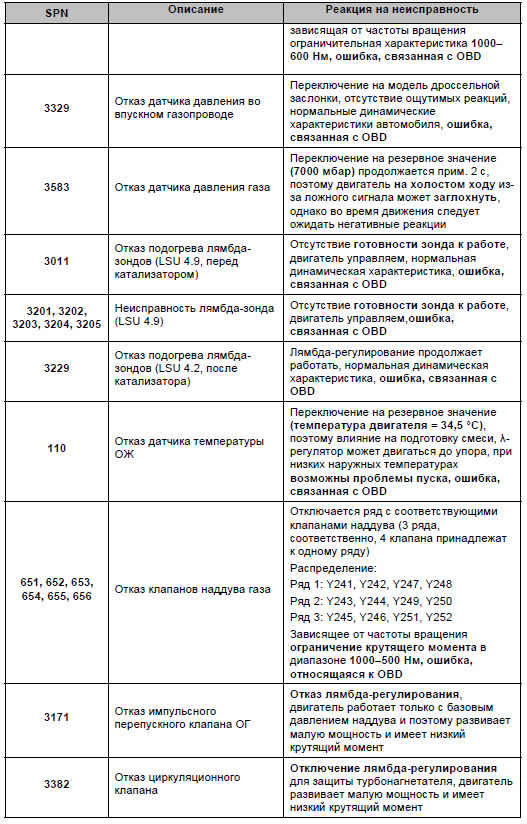 В следующей таблице приведены ошибки, которые при отказе электрически контролируемых компонентов двигателя приводят к специфическим реакциям на неисправность.