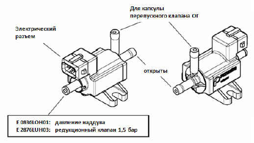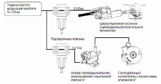 Пропорциональный перепускной клапан управляется сигналом широтно-импульсной модуляции (ШИМ) с выхода блока управления EGC4. Согласно этому сигналу клапан регулирования давления наддува варьирует давление со стороны перепускного клапана ОГ турбокомпрессора и тем самым положение заслонки перепускного клапана ОГ и, соответственно, давление