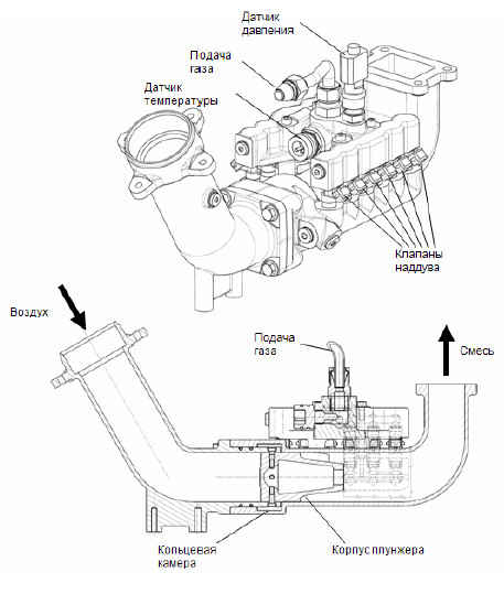 В газосмесителе установлены 12 клапанов наддува (подачи газа), которые активируются попарно. Газ подаётся на клапаны под давлением 7,0 бар и пропускается ими в оборотную кольцевую камеру. Отсюда через кольцевой зазор газ подмешивается к всасываемому воздуху.