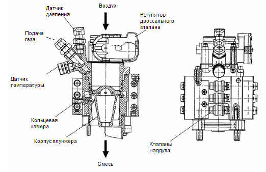 Газовый смеситель расположен в воздушном тракте за дроссельной заслонкой непосредственно перед трубопроводом распределения заряда рабочей смеси. Благодаря этому время прохождения горючей смеси до цилиндров относительно невелико, и, соответственно, улучшается приёмистость двигателя при динамичном режиме работы.