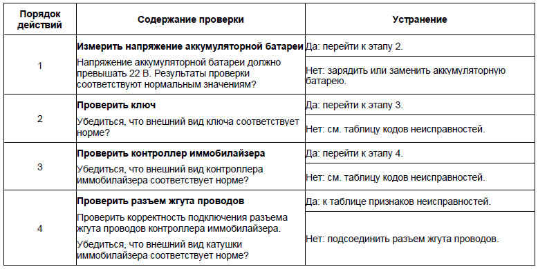 Эту таблицу следует использовать при определении причин неисправностей. Порядковый номер указывает на вероятность приведенных причин неисправности. Проверить в указанном порядке каждую деталь и при необходимости заменить ее.