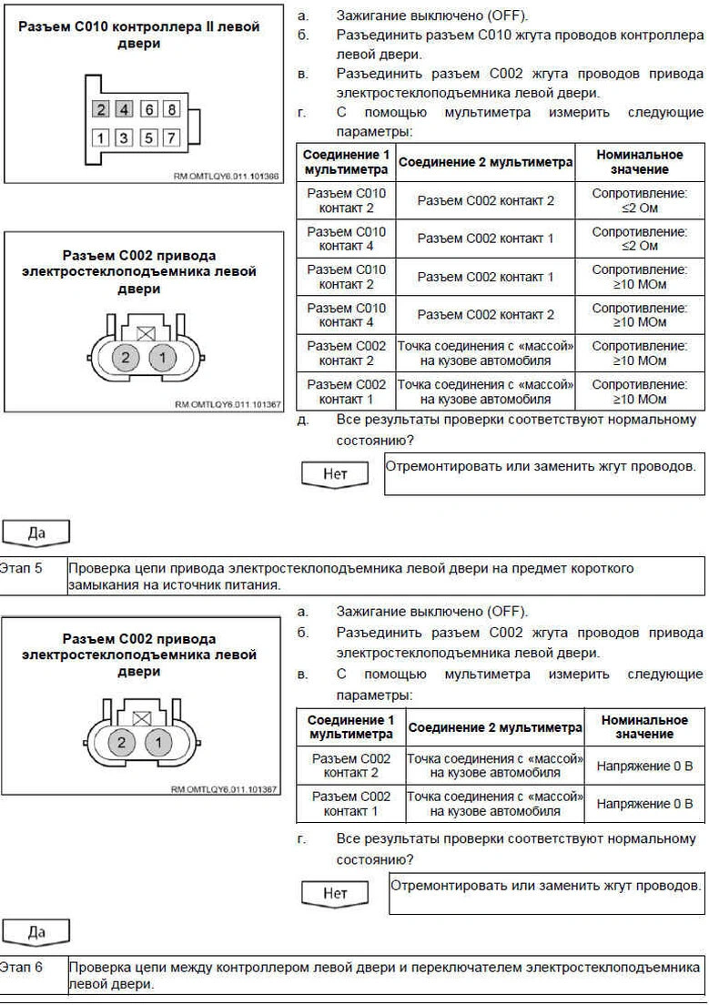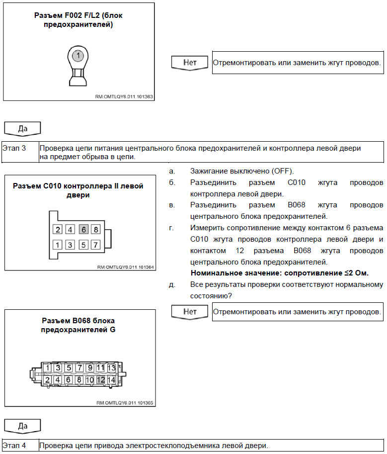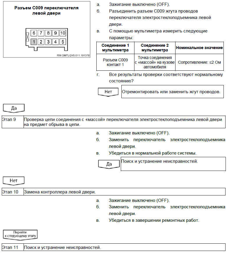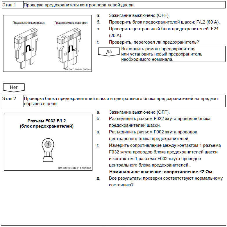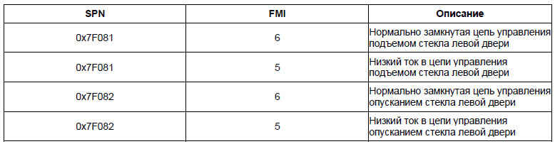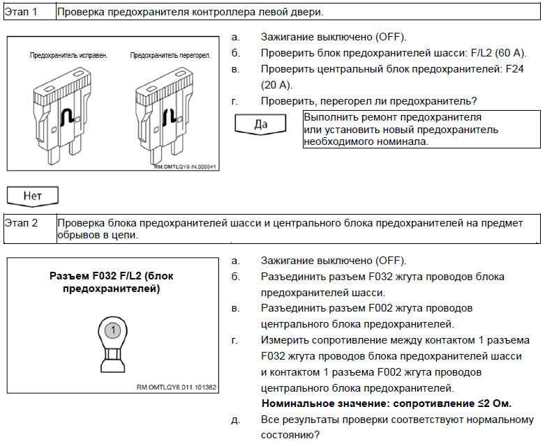 Вероятно неисправные компоненты: предохранитель / контроллер левой двери / жгут проводов / выключатель блокировки левой двери / привод левого электростеклоподъемника