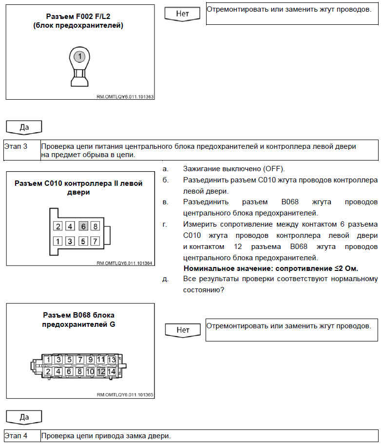 Вероятно неисправные компоненты: предохранитель / контроллер левой двери / жгут проводов / электропривод блокировки замка двери / контроллер замка двери
