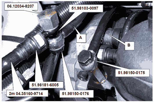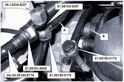 • Опять подключить полиамидную трубку (B) с полым болтом 51.98150-0175 к насосу высокого давления.