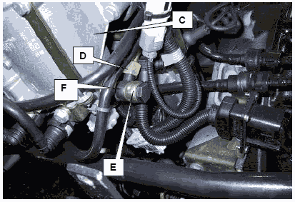 • Демонтировать кольцевой штуцер (F) и опять подключить к топливному центру KSC трубопровод слива, ведущий к топливному резервуару, с помощью короткого полого болта 51.98150-0175.
