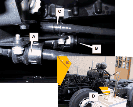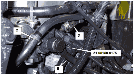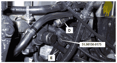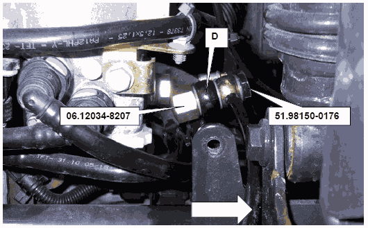 • Запустить двигатель и при частоте вращения холостого хода проверить, выступает ли топливо из трубопровода (D). При работающем двигателе допускается выход лишь нескольких капель топлива. Если объем просачивающегося топлива слишком велик, заменить клапан ограничения давления и после этого повторить эту проверку.