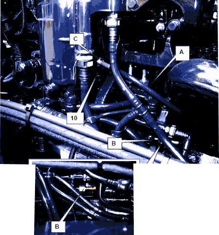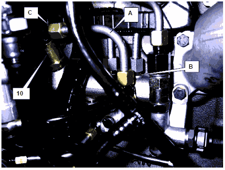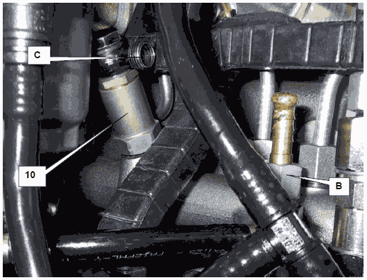 Завести двигатель и проверить, выступает ли топливо при открытом подключении (C) клапана ограничения давления (10). При работающем двигателе допускается выход лишь нескольких капель топлива. Если выступило слишком много топлива, то необходимо заменить клапан ограничения давления DBV и затем повторить эту проверку или замер общей величины утечки.