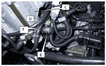 • Демонтировать кольцевые штуцеры (F) и вновь подключить трубопровод слива к топливному резервуару с коротким полым болтом 51.98150-0175 на KSC.