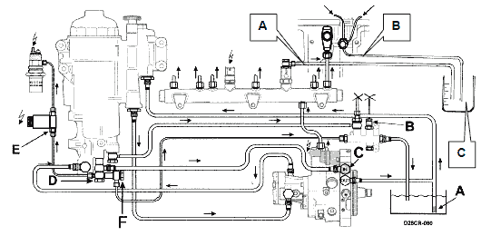 B= возвратный трубопровод к топливному резервуару