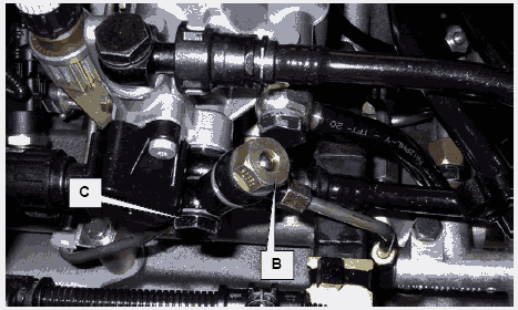 • Демонтировать перепускной клапан (B) для регулирования давления и полый болт подключения (C) 51.98150-0148 факельного устройства.