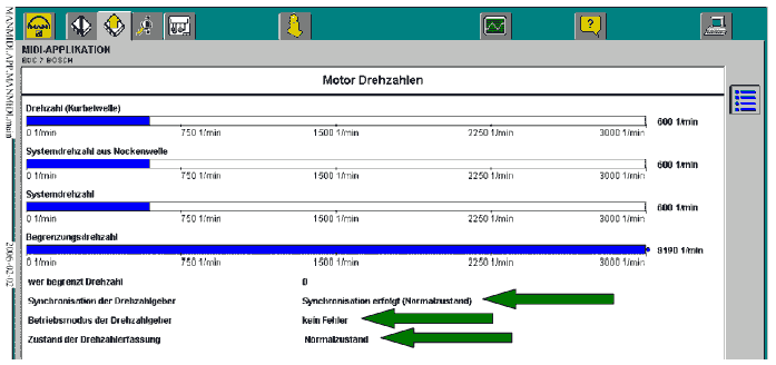 • Сообщения о статусе в Мониторинге частоты вращения (Monitoring Drehzahlen). Обычное состояние: «Осуществляется синхронизация», «Неполадка отсутствует», «Обычное состояние».