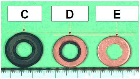 C= не в порядке. Наружный диаметр в сдавленном состоянии 17 мм, толщина 1 мм. D= в порядке. Наружный диаметр в сдавленном состоянии 15,5 мм, Толщина 1,3 мм. E= Наружный диаметр в демонтированном состоянии макс. 15,2 мм, Толщина 1,5 ±0,05 мм.