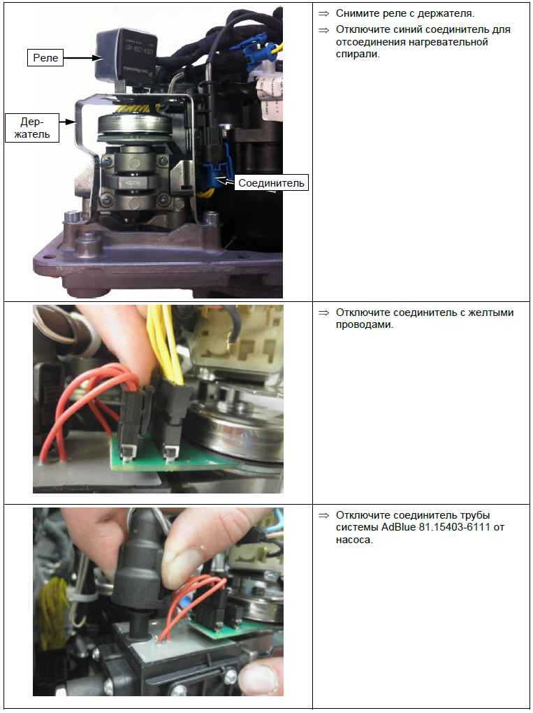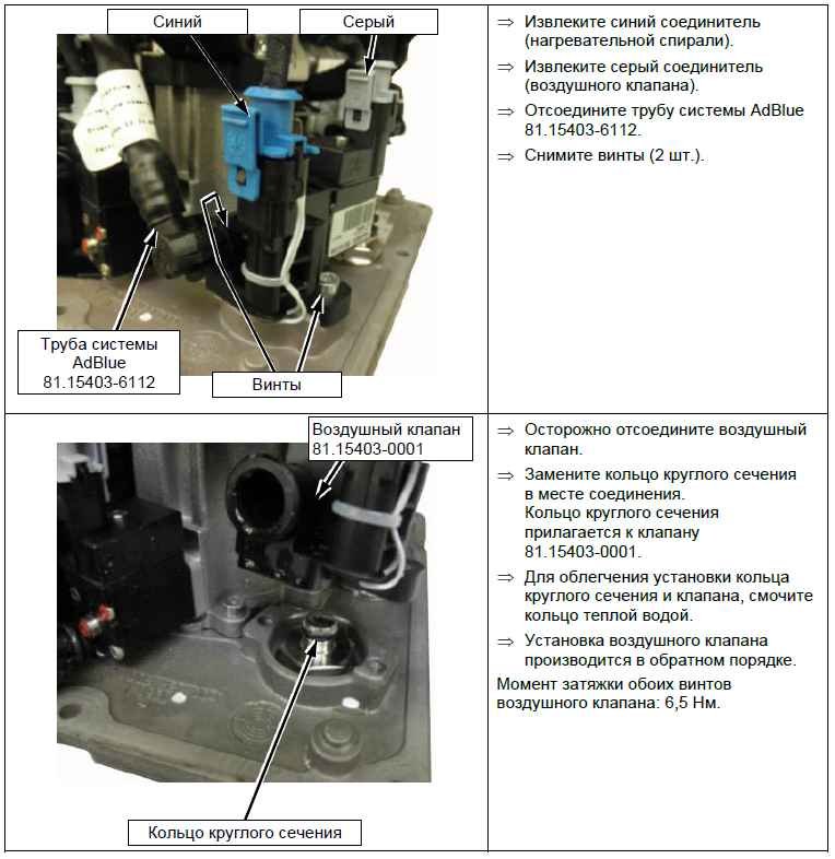 Отключите установку AdBlue через MAN-cats. Ремонт модуля подачи AdBlue. Автомобили c двигателем до Euro-5 включительно: выполните ремонт модуля подачи AdBlue согласно описанию ниже. Автомобили с двигателем стандарта Euro-6: замените модуль подачи AdBlue. Снимите дозатор, датчик заполнения и емкость для AdBlue (если она отдельная). Очистите дозатор, датчик заполнения, трубы системы AdBlue и емкость для AdBlue горячей водой без чистящих средств.