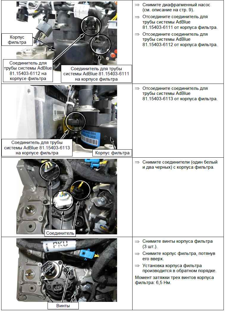 Ремонт модуля подачи возможен при наличии одной или нескольких из следующих неисправностей. При испытании регулирующих устройств не повышается давление в диафрагменном насосе. При испытании регулирующих устройств не сбрасывается давление в воздушном клапане. Срабатывает предохранитель F 738. Причиной может быть короткое замыкание на корпусе фильтра 81.15403-0004, вызванное негерметичностью нагревательного стержня. Замените корпус фильтра 81.15403-0004 согласно описанию ниже. Сообщение об ошибке или диагностическая запись HDS 5031. Демонтируйте, разберите и очистите диафрагменный насос 81.15403-6101 согласно описанию ниже. Если в диафрагменном насосе обнаруживаются повреждения, замените его. Одно или несколько из следующих сообщений об ошибках (и/или диагностические записи): HDS 5009, HDS 5021, HDS 5022, HDS 5030, HDS 5033, HDS 5036, HDS 5037, HDS 5081.