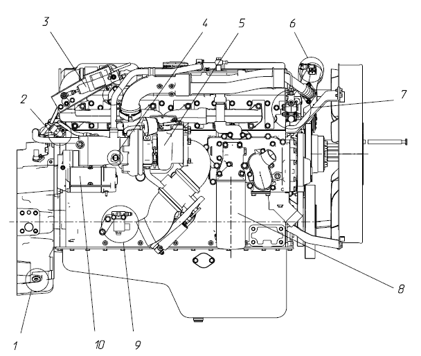 Расположение агрегатов и узлов двигателя ЯМЗ-536 (вид справа):