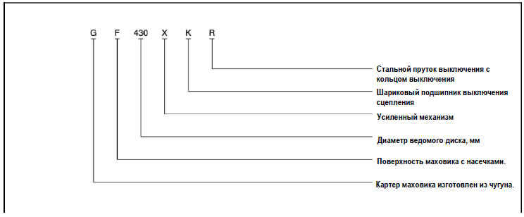 Автомобиль оснащен традиционным сухим однодисковым диафрагменным сцеплением GF430 и картером сцепления SAE1. Далее приведена расшифровка наименования модели сцепления: