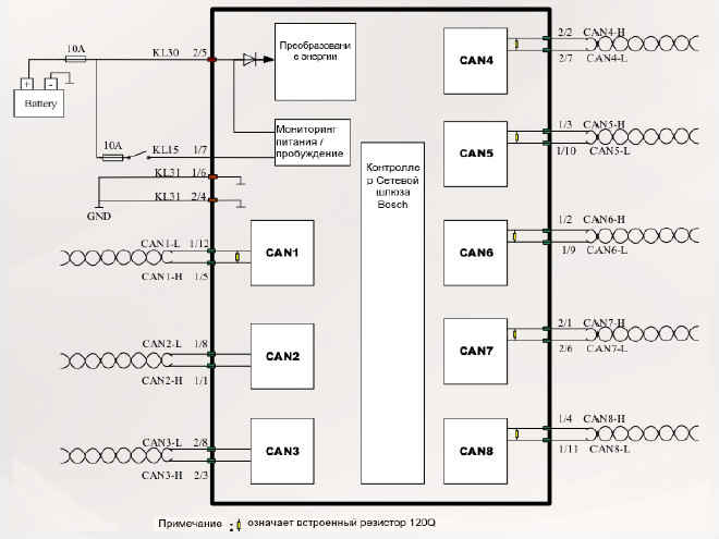 Основные функции заключаются в том, чтоб передавать сообщения CAN, которые взаимодействуют между различными контроллерами транспортных средств, снижать коэффициент нагрузки линии CAN, и контролировать состояние сети CAN целого автомобиля.