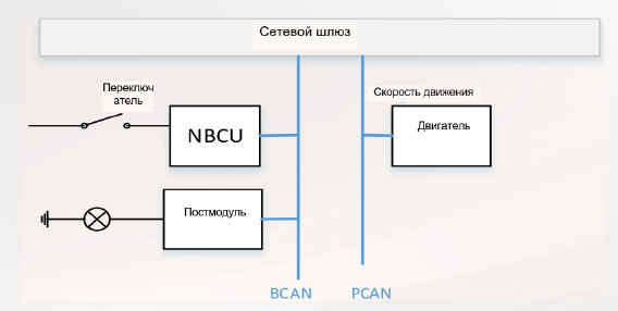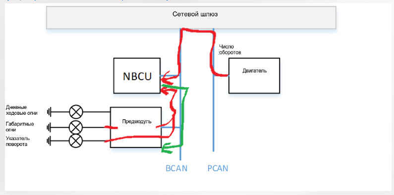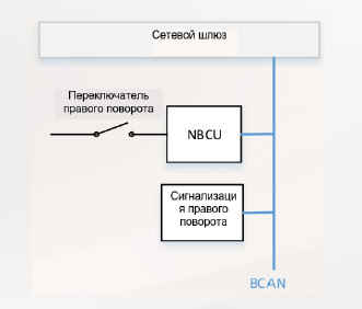 BCAN:Выключатель подключен к NBCU, NBCU посылает сообщение на передний и задний модули, передний и задний модули приводят свет