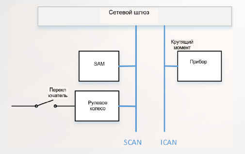 • SAM получает переключающий сигнал, собранный модулем руля, и передает его на центральную панель управления или приборную панель.