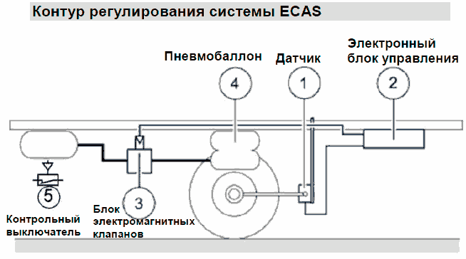 В отличие от механической системы управления пневмоподвеской система ECAS управляется электронным блоком управления, обрабатывающим сигналы датчиков и приводящим в действие